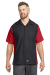 RedKap Adult 4.25 Ounce Short Sleeve Two Tone Crew Shirt. 4.25 oz. Cotton ripstop texture. 65% polyester/ 35% cotton, permanent press. Touchtex technology with superior color retention, soil release and wickability. Concealed, no scratch, button-front placket. Two button thru hex pockets with pencil stall on left front pocket and utility pocket on left sleeve. Straight bottom hem. Ships from Nashville, TN.